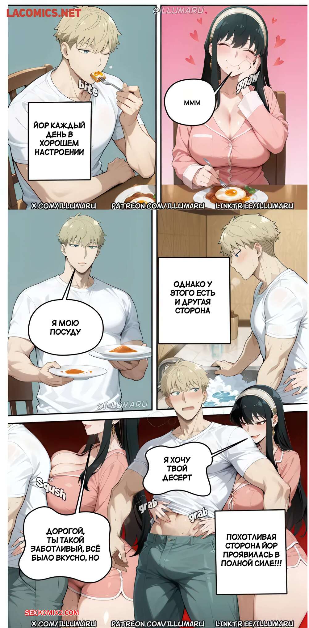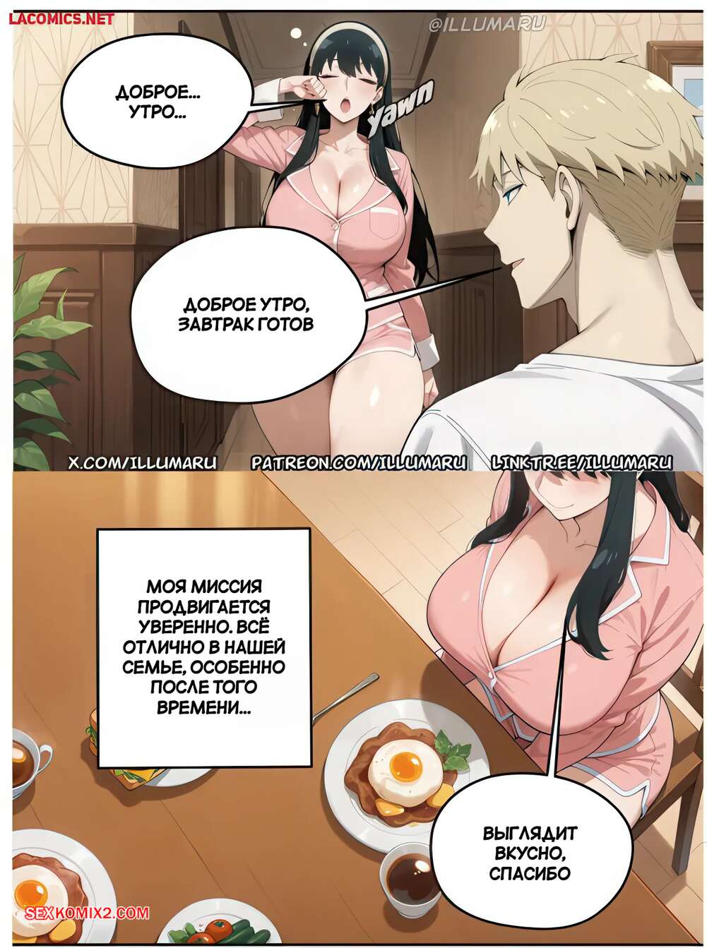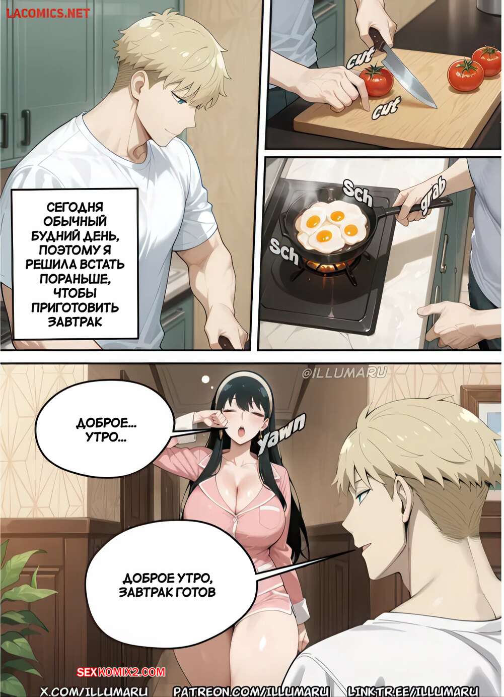 Порно комикс Spy x Family. Успешный план Йор. Часть 2. Yors successful plan. illumaru Красотка Йор проснулась с утра и пошла на кухню, где парень готовил для нее завтрак. Девушка находится в игривом настроении и начинает ласкать парня, желая получить его член.