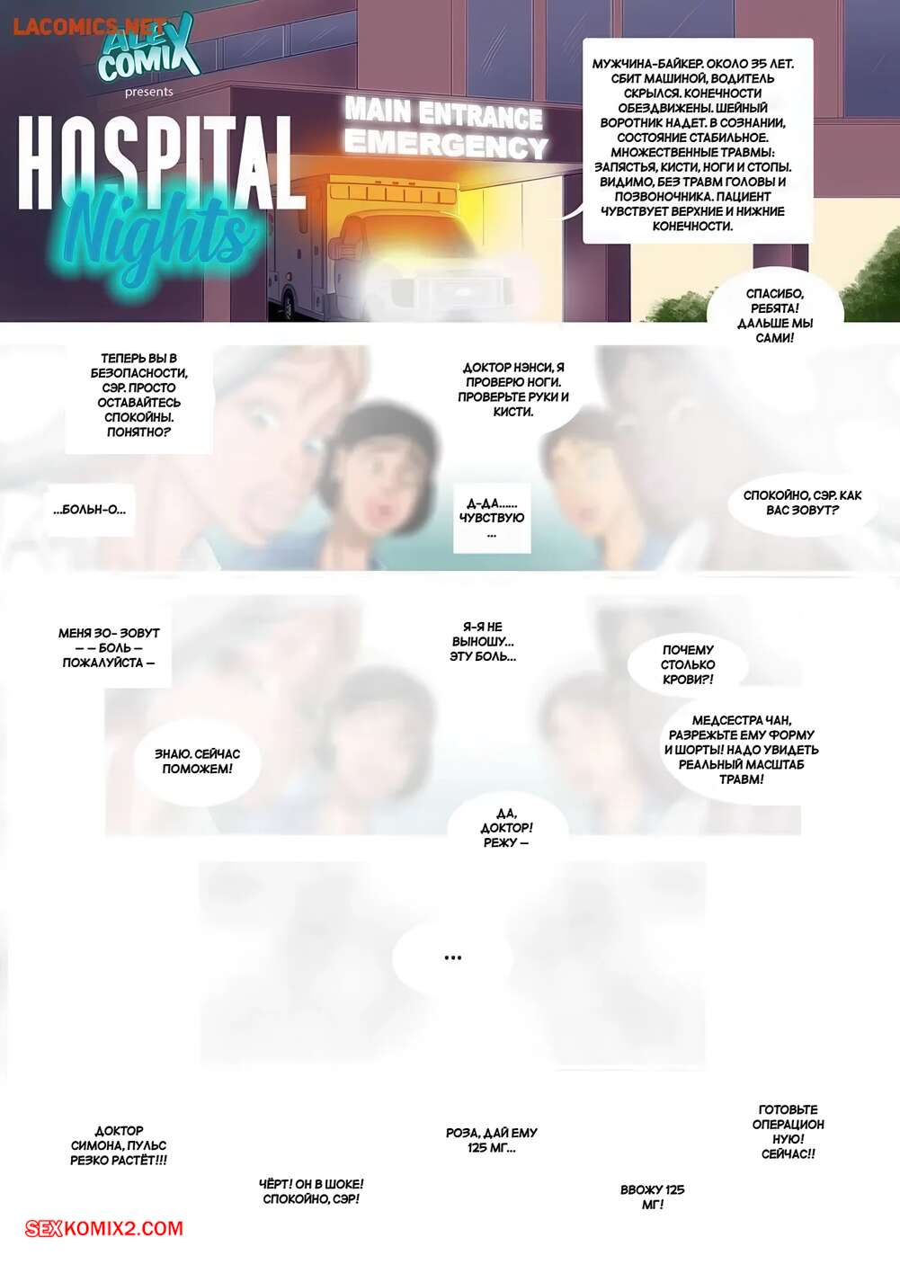 Порно комикс Ночь в госпитале. Hospital Nights. AlexComix. Парень попал в больницу, где он попал под опеку горячих медсестер. Пока он был в отключке, огромный хуй парня стал твердым, поразив девушек. Теперь у них текут слюнки.