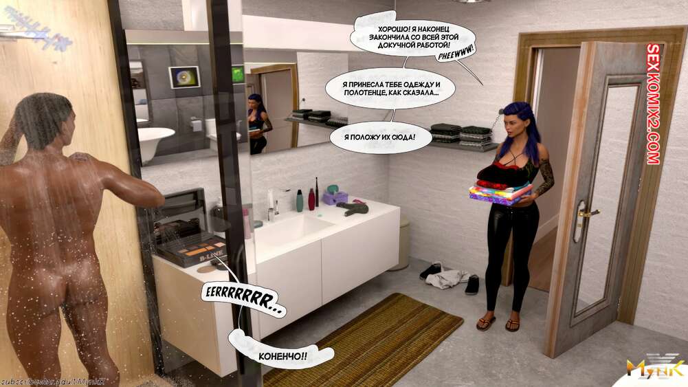 Порно комикс Ее.. девушка. Her Girlfriend. Mynkx. Красотка пригласила парня к себе домой, чтобы он принял душ. Девушка присоединилась к нему и стала сосать его член, после чего раздвинула ножки и дала себя выебать.