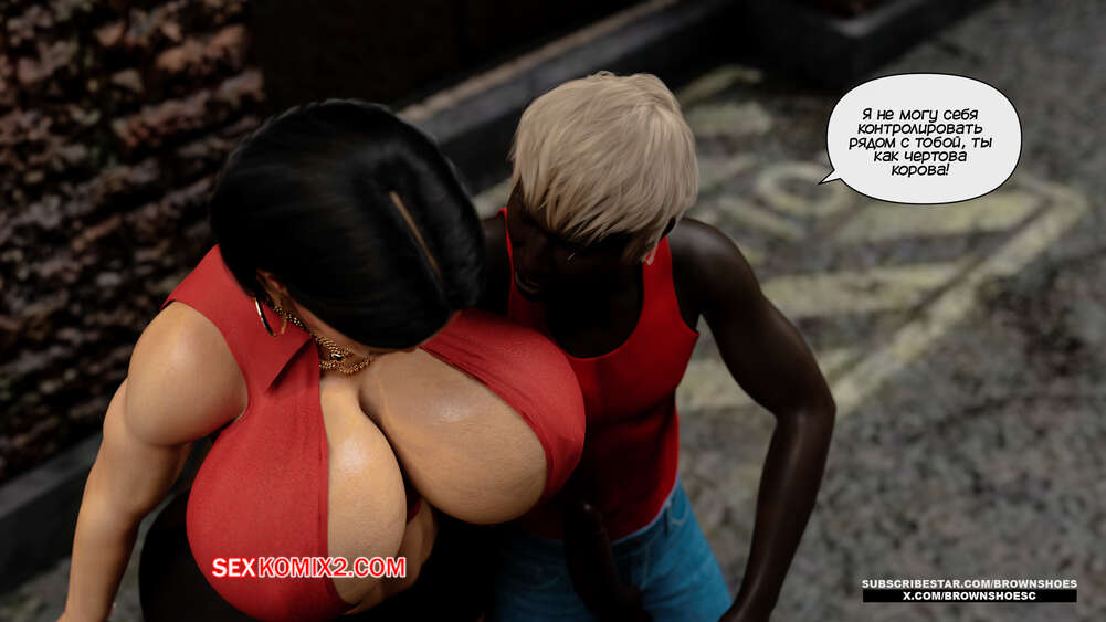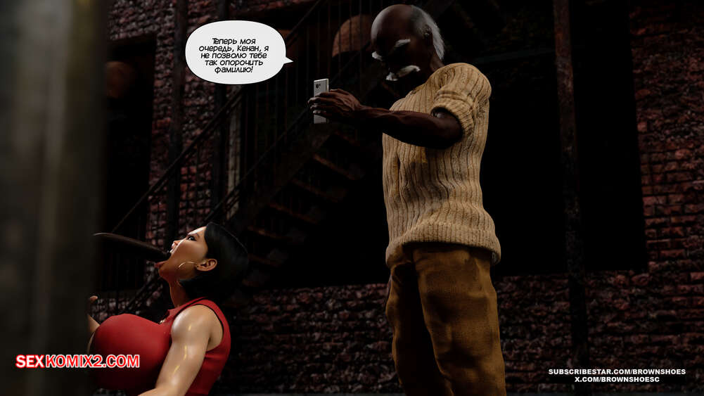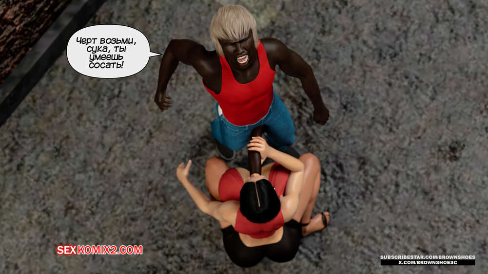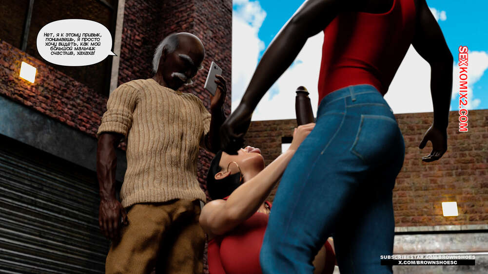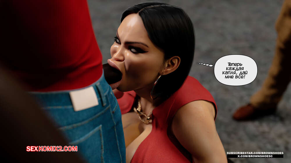 Порно комикс Изменяющие шлюхи бимбо жены. Часть 4. Cheating Sluts Bimbo Wifes. Brown Shoes Горячая милфа Сара встретилась в переулке с темнокожим стариком и его сыном. Красотка встала на колени перед молодым парнем и отсосала его член, после чего ей занялся старик.