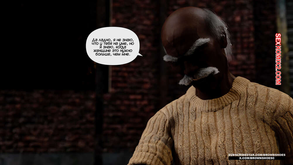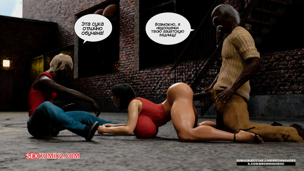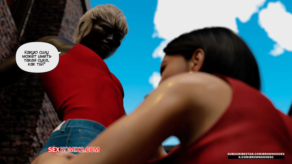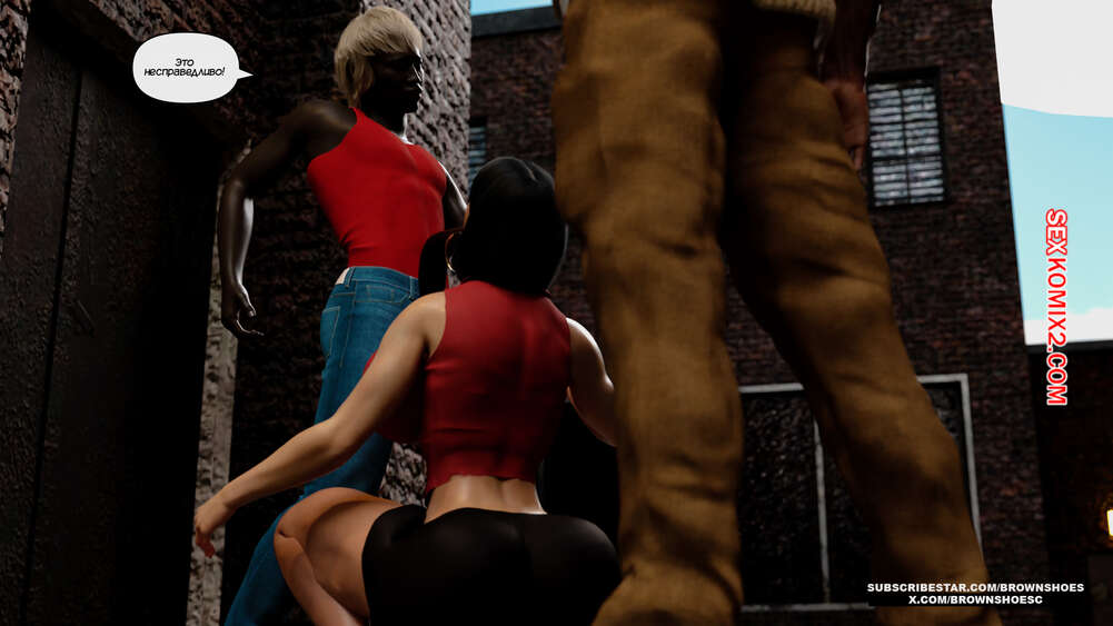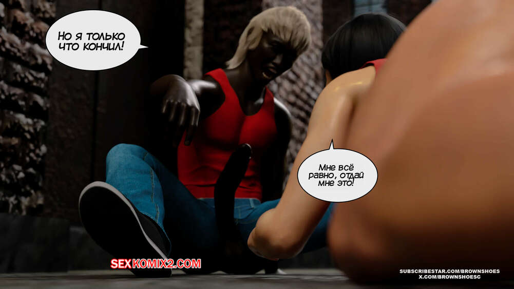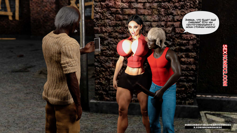 Порно комикс Изменяющие шлюхи бимбо жены. Часть 4. Cheating Sluts Bimbo Wifes. Brown Shoes Горячая милфа Сара встретилась в переулке с темнокожим стариком и его сыном. Красотка встала на колени перед молодым парнем и отсосала его член, после чего ей занялся старик.
