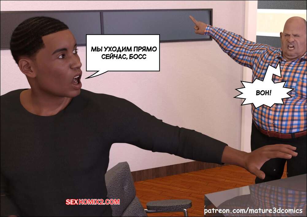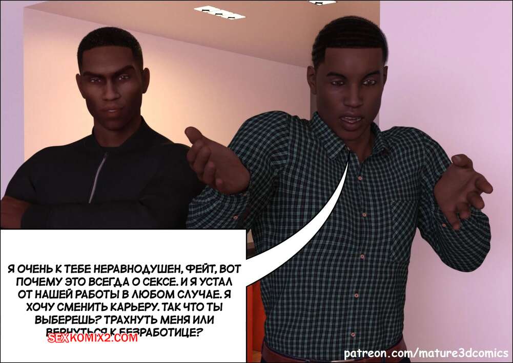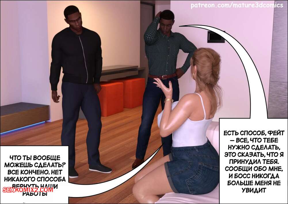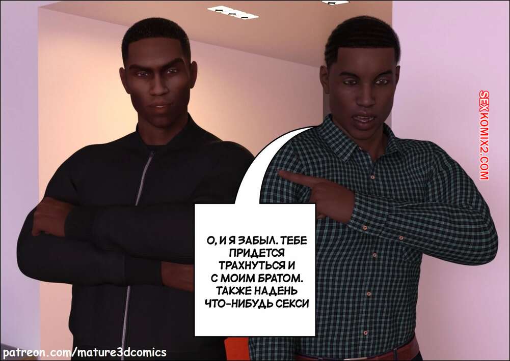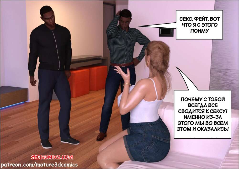 Порно комикс Неверная. Часть 6. Faithless. Mature3DComics Темнокожие парни навестили горячую милфу у нее дома, желая с ней пошалить. Сучка встала на колени и отсосала их большие хуи, после чего дала себя выебать в пизду и задницу.