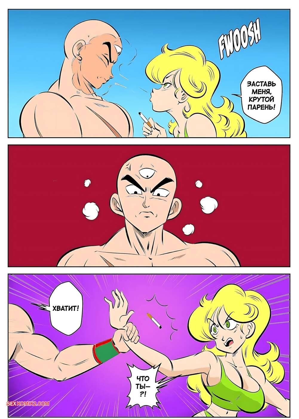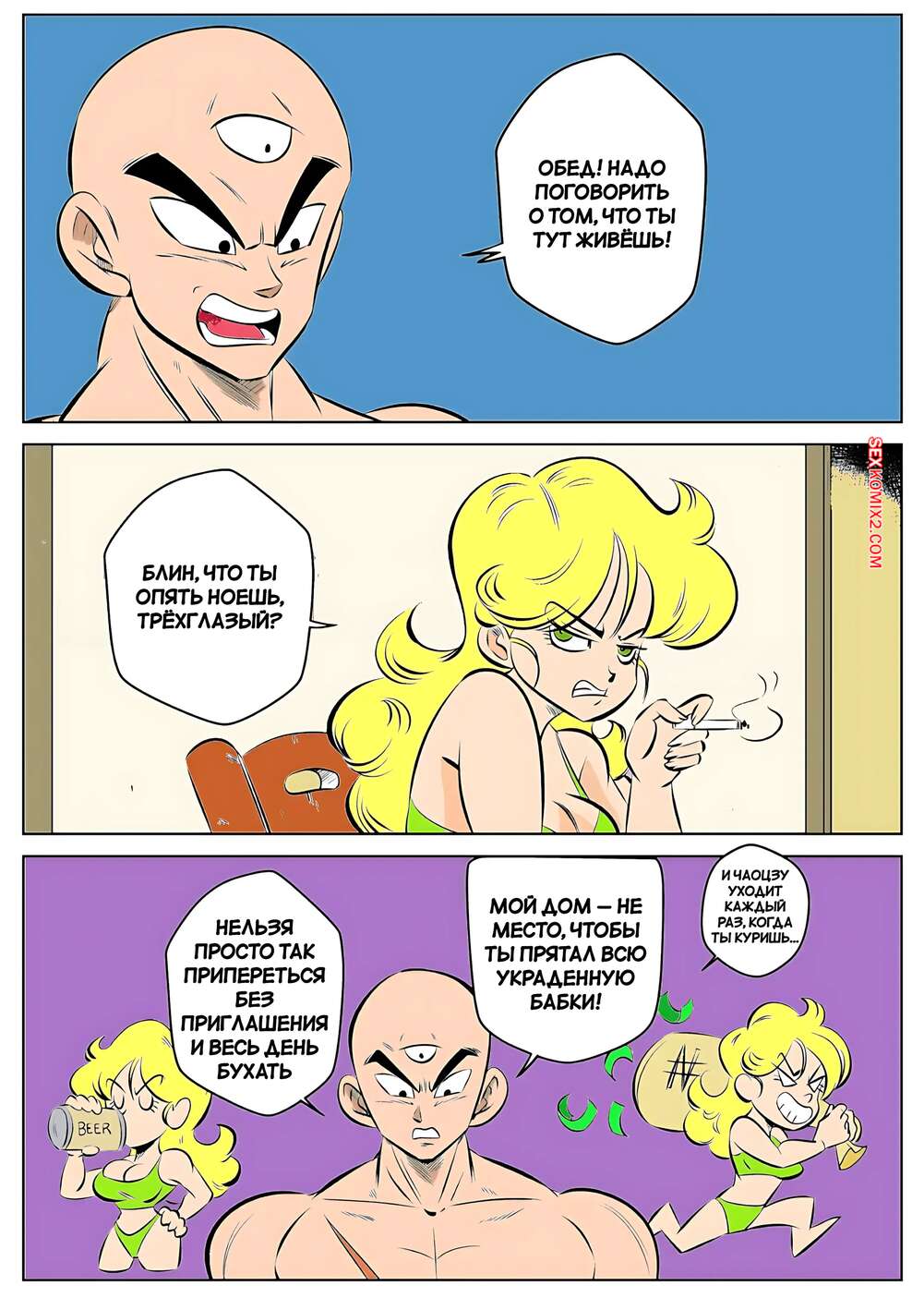 Порно комикс Dragon Ball. Неудачное начало. Failure to launch. FunsexyDB. Парню не нравится, что блондиночка постоянно бухает, и решил ее наказать. Он стянул с нее шортики и отшлепал попку красотки, после чего вставил в нее член и хорошенько выебал девушку.