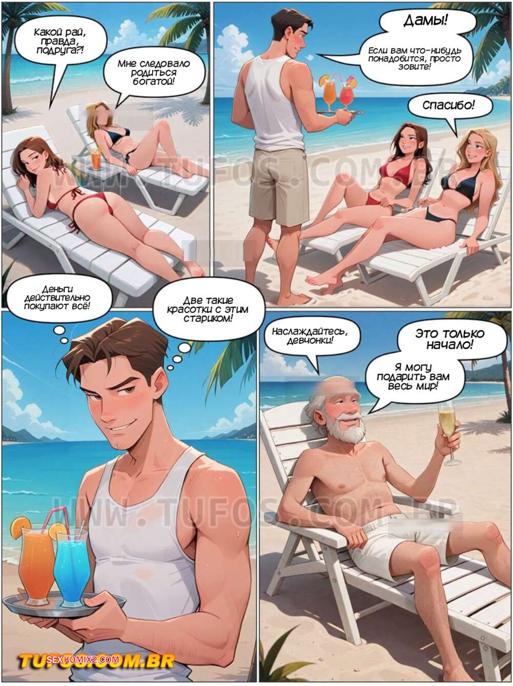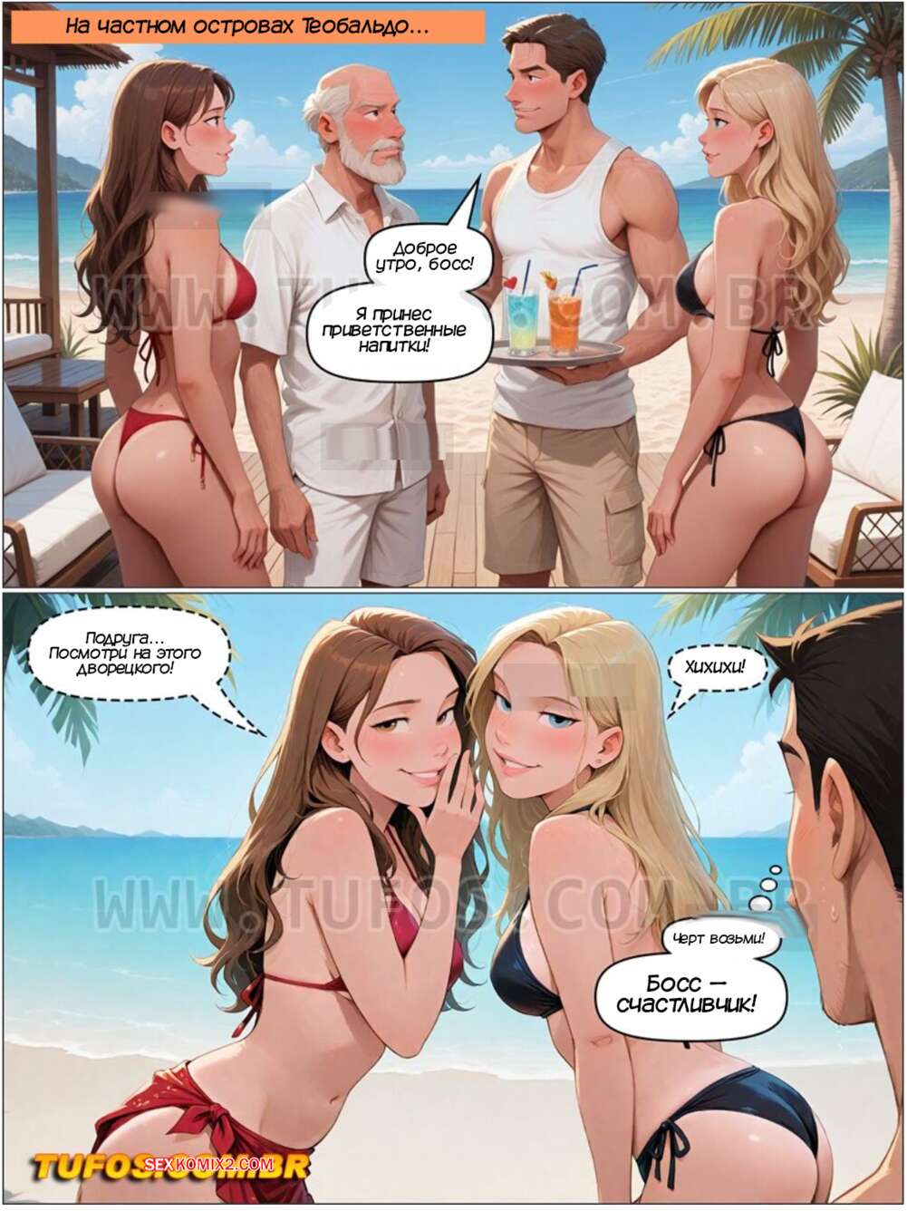 Порно комикс Дом мамы Джоаны. Часть 36. Casa da mae Joana. Tufos Старик отправился на свой остров и позвал с собой молодых горячих девушек, чему они были очень рады. Сучки хотели трахаться и стали соблазнять старика, но у него хуй не встал, поэтому молодому парню Карлосу пришлось подменить босса.