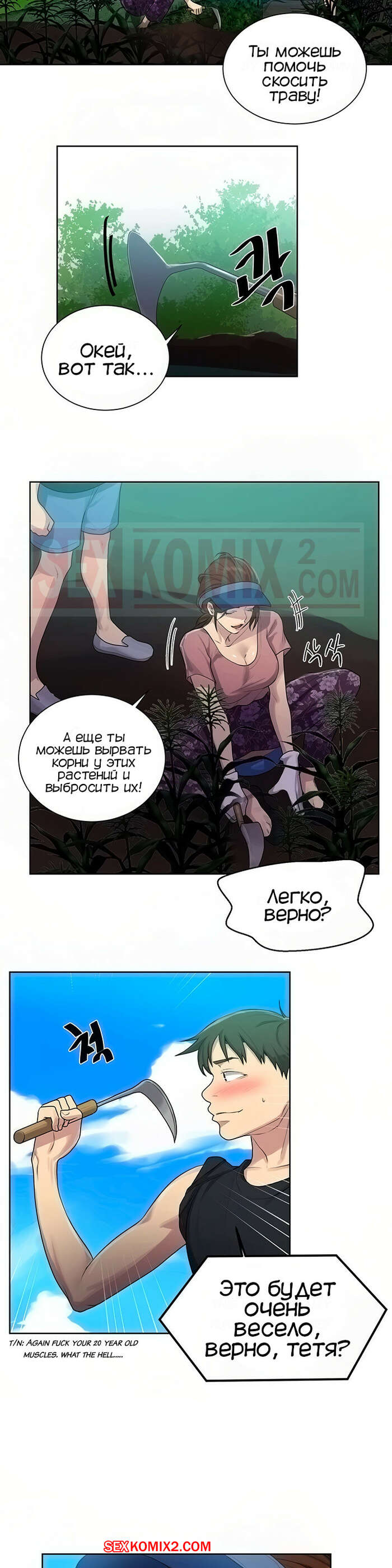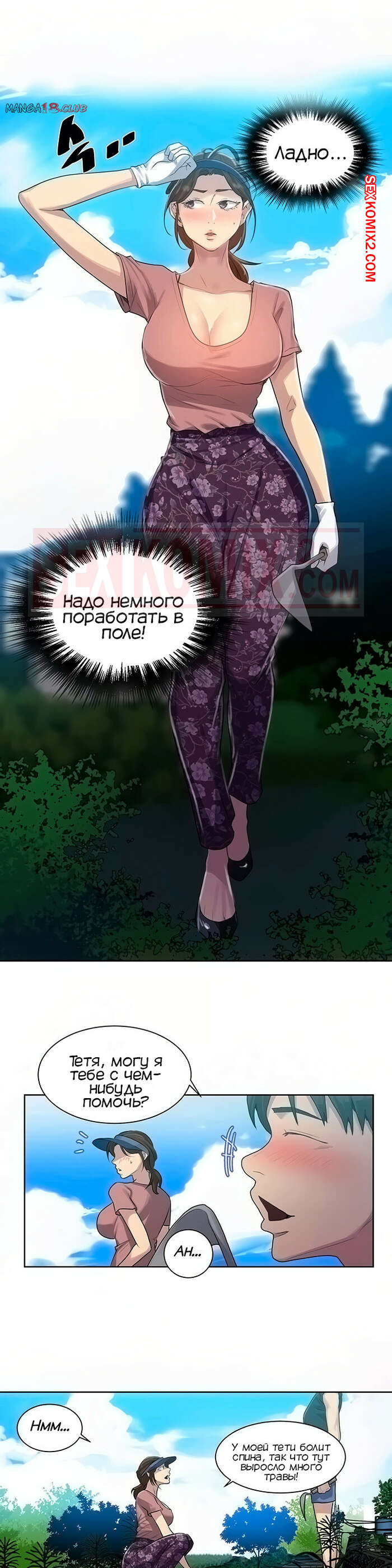 Порно комикс Тайное обучение. Часть 83. Secret Class. Парень отправился со своей горячей тетей на огородный участок. Женщина начала низко наклоняться чтобы прополоть цвету, а он не мог оторвать свой взгляд он ее сочной попки и рука сама потянулась ее потрогать.
