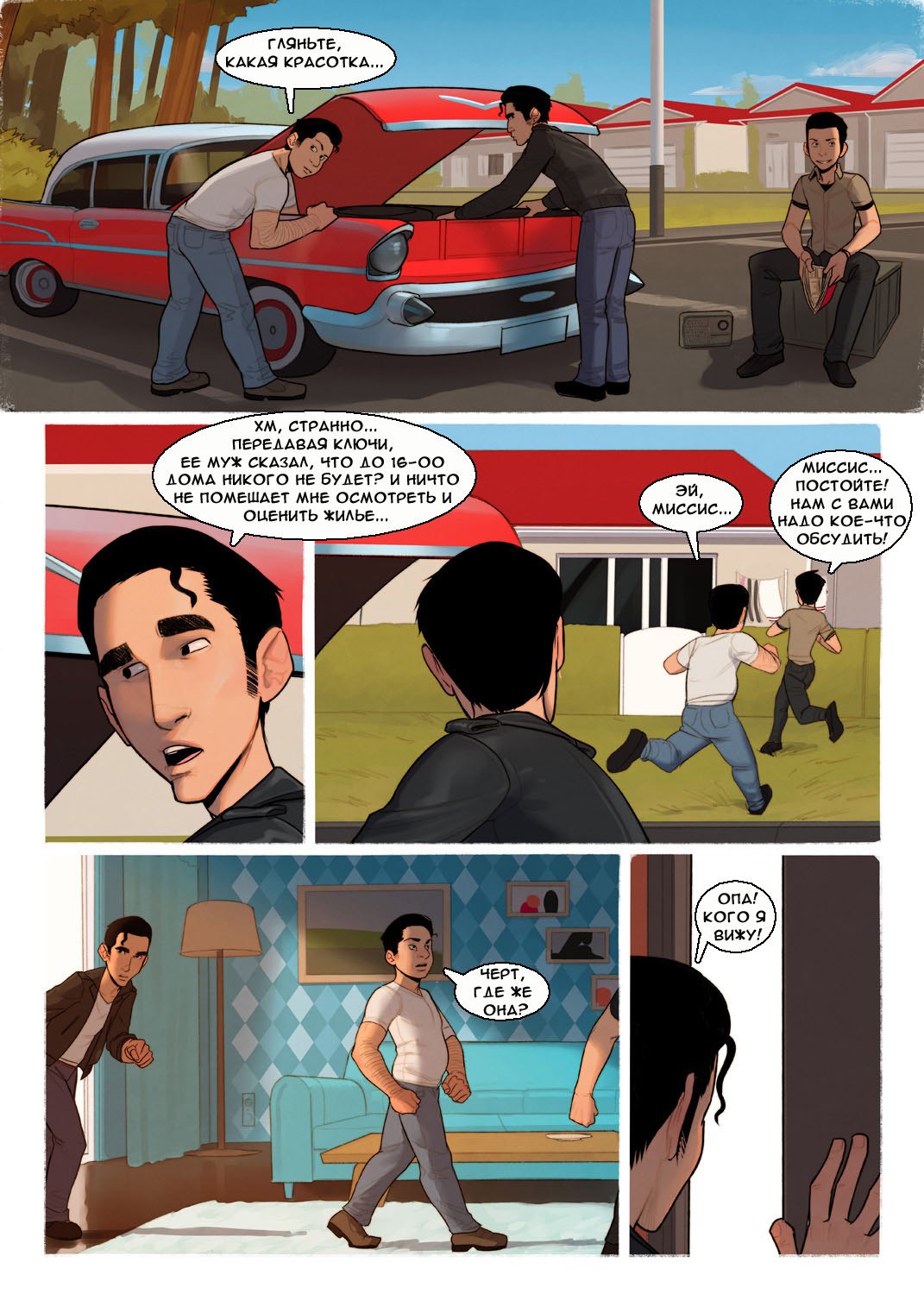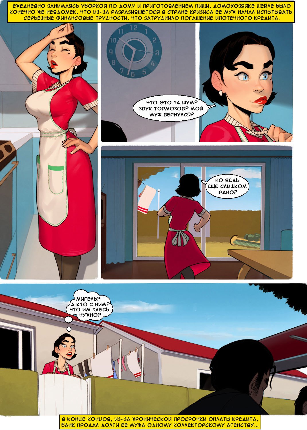 Порно комиксы леди «Как в старые добрые времена». Озабоченная домохозяйка сидит дома одна и не знает чем бы ей заняться. Она уже убралась дома, вымыла всю посуду и приготовила ужин своему мужу. Женщина истосковалась по горячему и энергичному сексу, она увидела в соседнем дворе трех парней которые ремонтировали машину. Милфа пригласила их к себе в дом под предлогом попить чай. Но прямо с самого порогу начала соблазнять их, демонстрируя свое нежно тело. Парни сразу повелись на это соблазн и трахнули её в три члена.