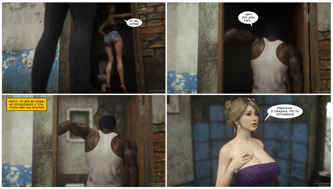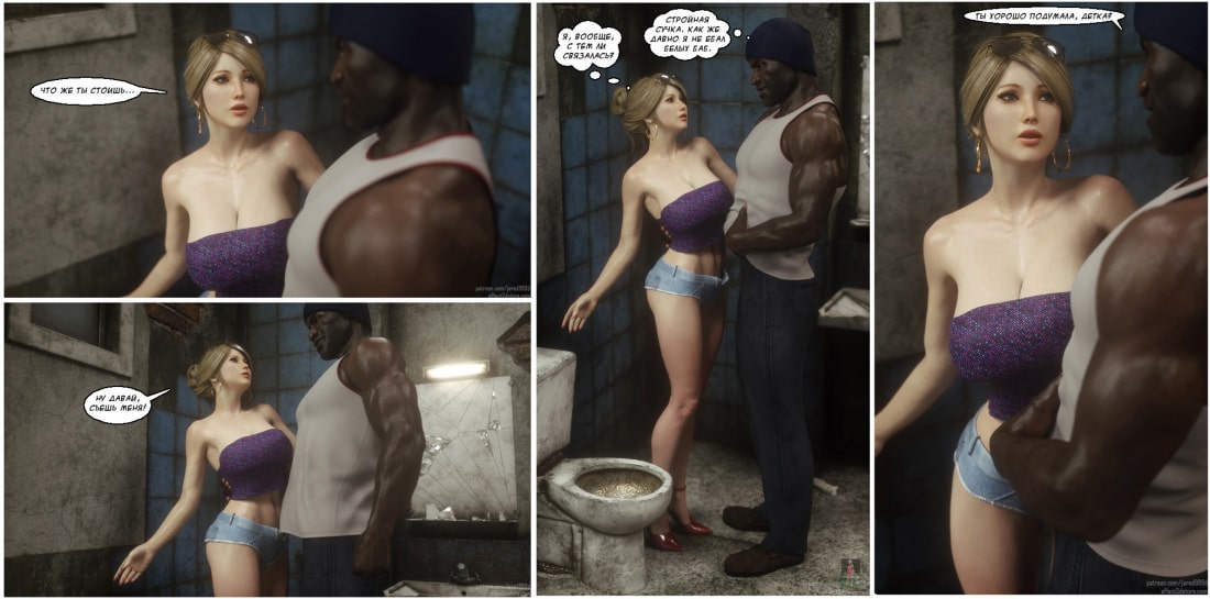 Порно комиксы 3 д. Дикарка Сью. Неуправляемая страсть. Молоденькая блондиночка гуляла по неблагополучным у району города, и зашла в тёмный переулок, где тусовались чернокожие парни. Один из парней последовал за ней, и попытался познакомиться. Девушка не была против, ведь именно для этого она туда и пришла. После недолгого диалога, девушка сама потащила парня заняться с ним сексом. Но поскольку в районе не было ничего приличного, они пошли в ближайший туалет. Который выглядел не очень-то чистым, но девушку уже ничего не могло остановить. Она была возбуждена и плавочки очень сильно намокли.