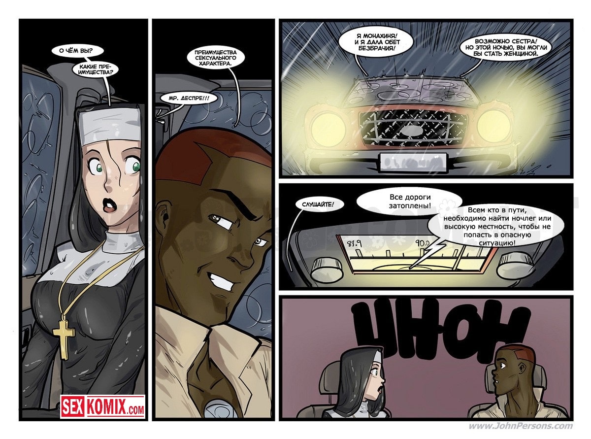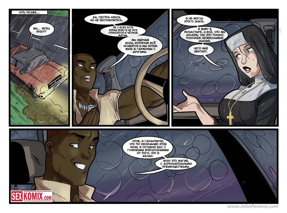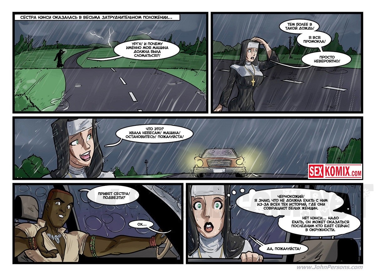 Порно комикс Изменение веры. Сексуальная монахиня повстречала африканского преподобного, и чернокожий парень предложил ей сменить веру. Но красотка не могла даже думать о таком, так как это был большой грех. Но убеждение парня оказались очень сильными, он сказал, что в его вере они могут заниматься сексом свободно и чем горячее тем лучше. Блондинка не могла противостоять этому, она уже давно не трахалась и соблазнить её большим членом оказалось очень просто.