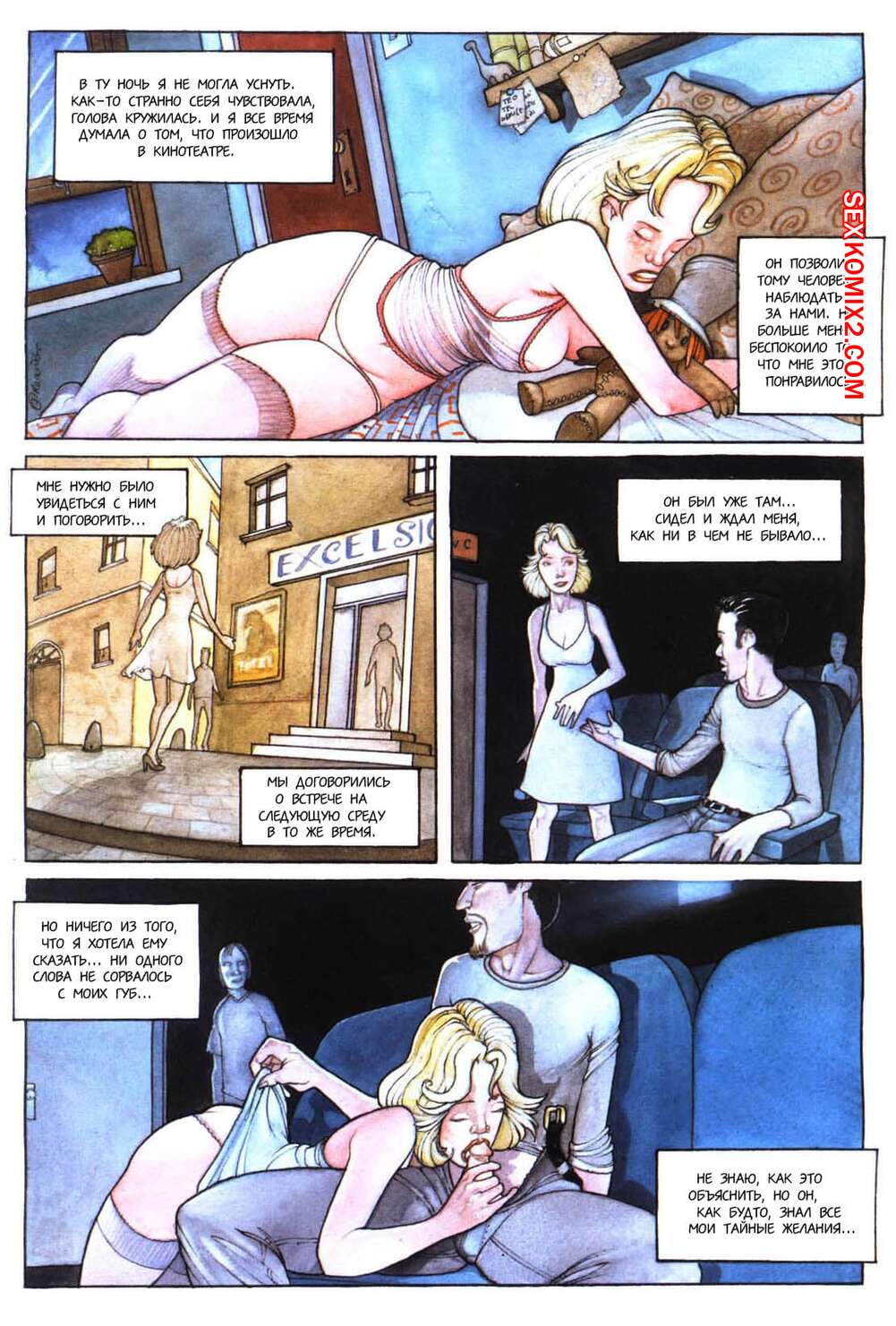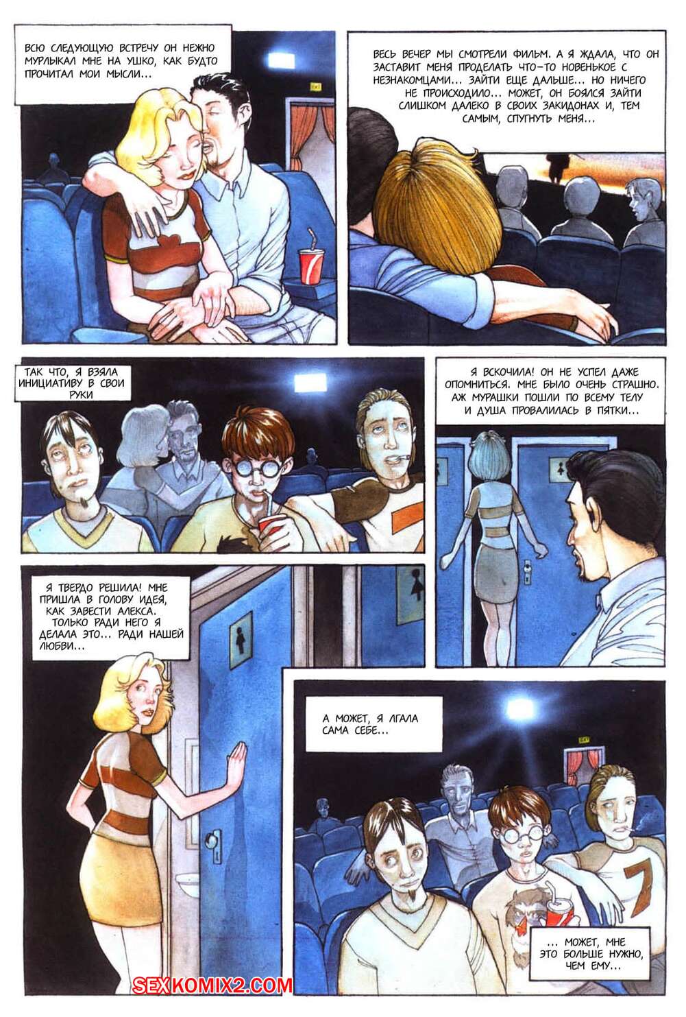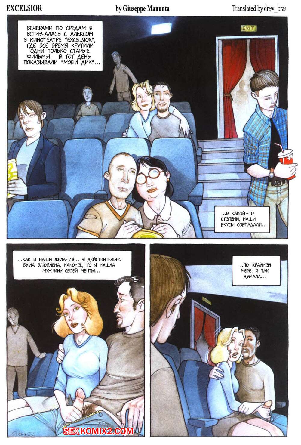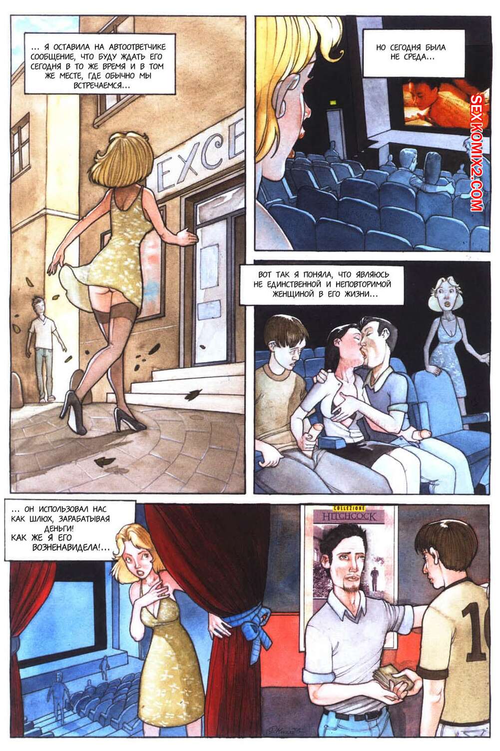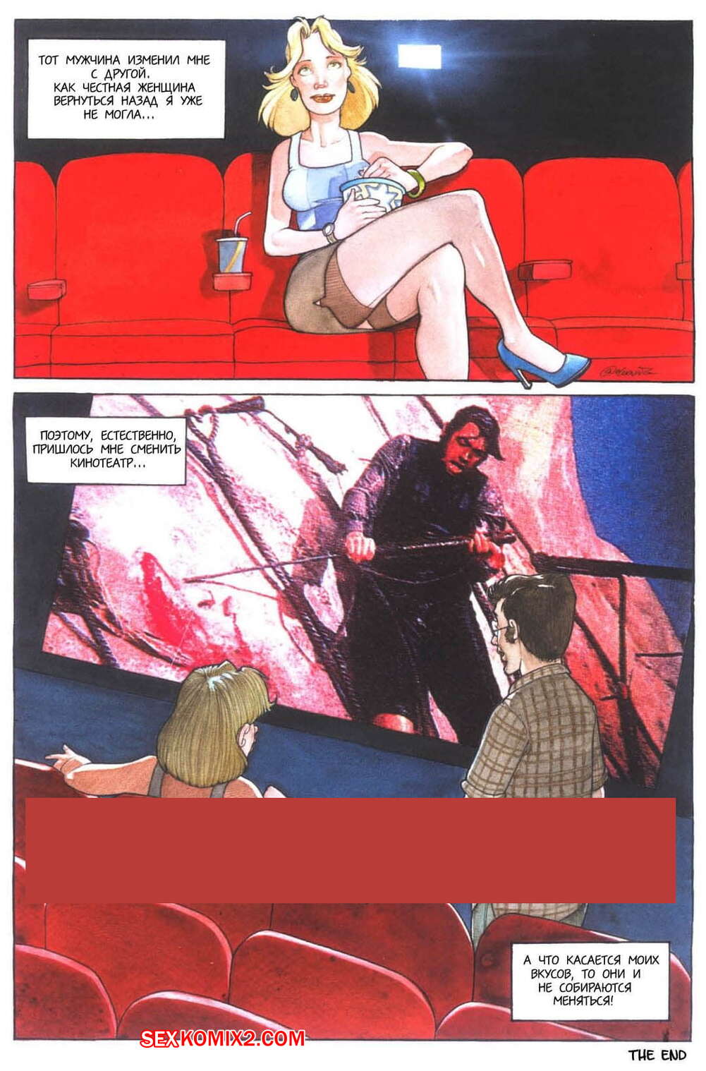 Порно комикс Эксцельсиор Горячая блондинка любит ебаться с левыми мужиками, поэтому часто ходит в кино, где отсасывает парням, которые сидят рядом с ней, а затем раздвигает свои ножки и они ее хорошенько ебут.