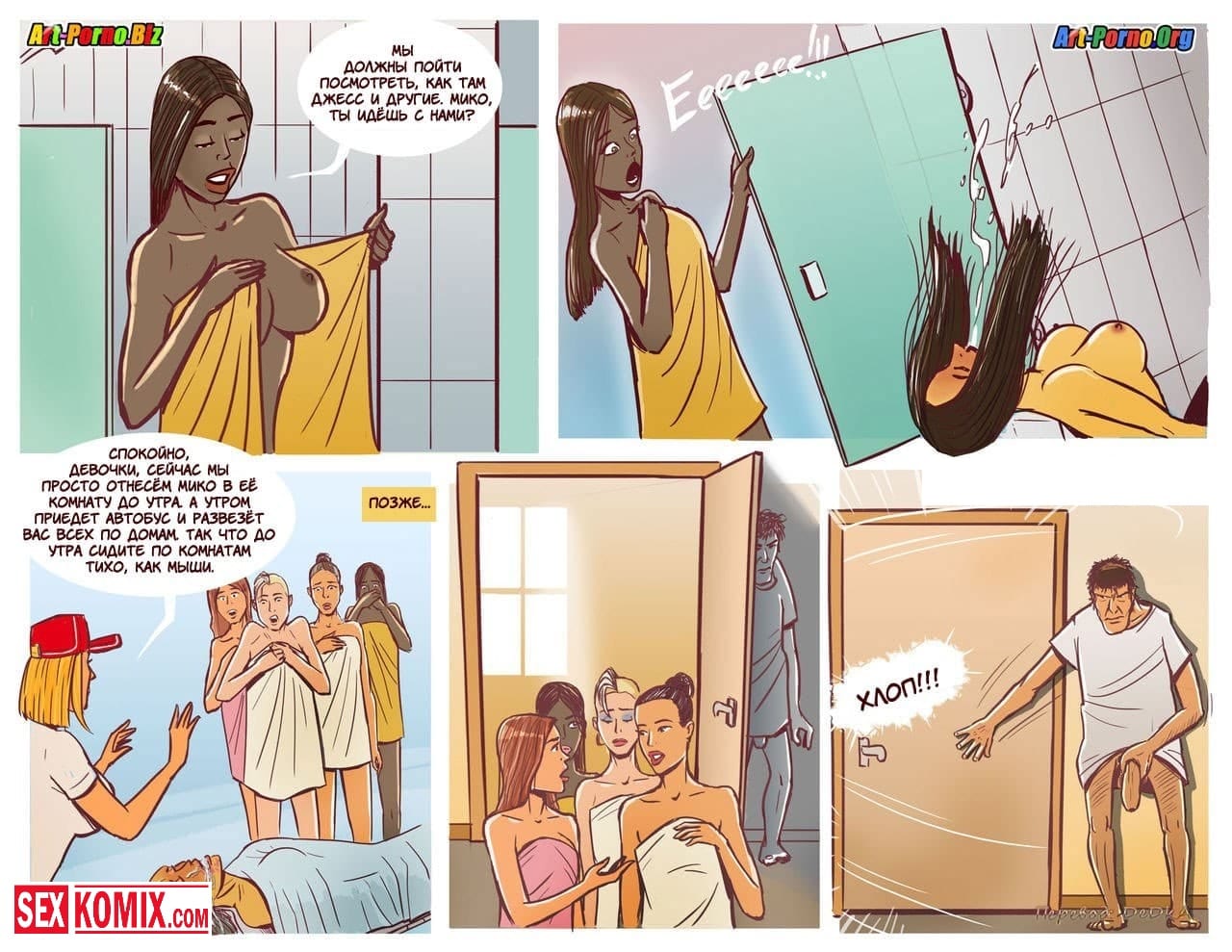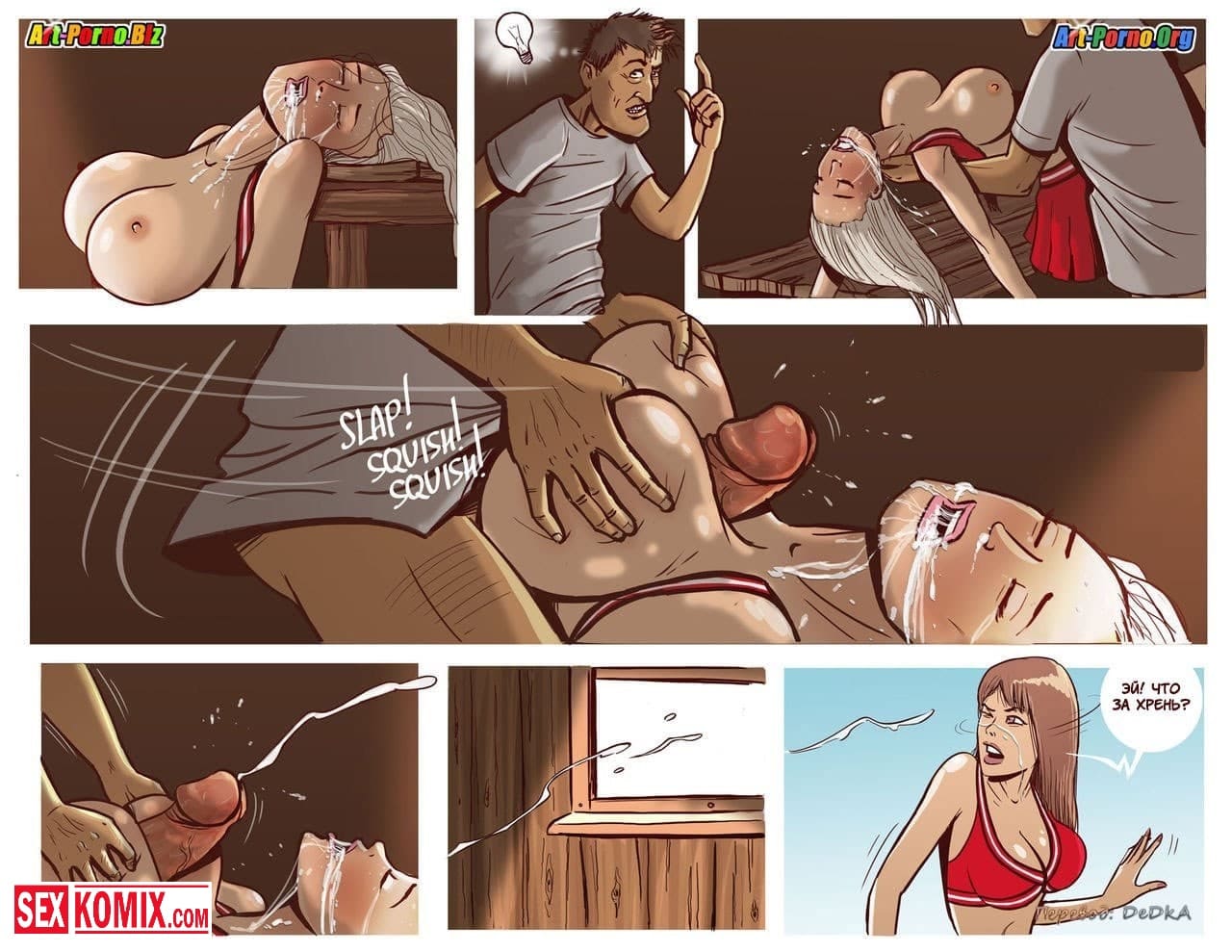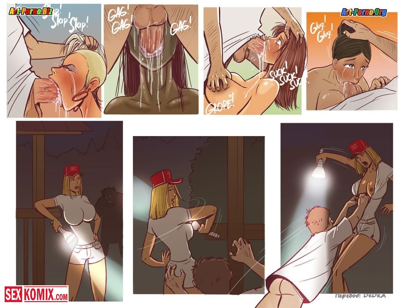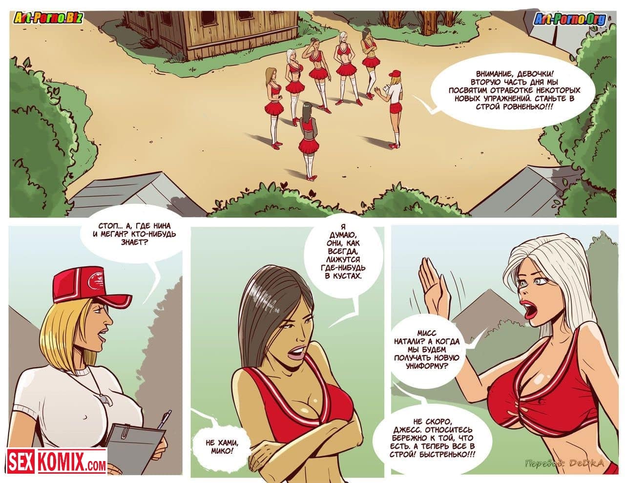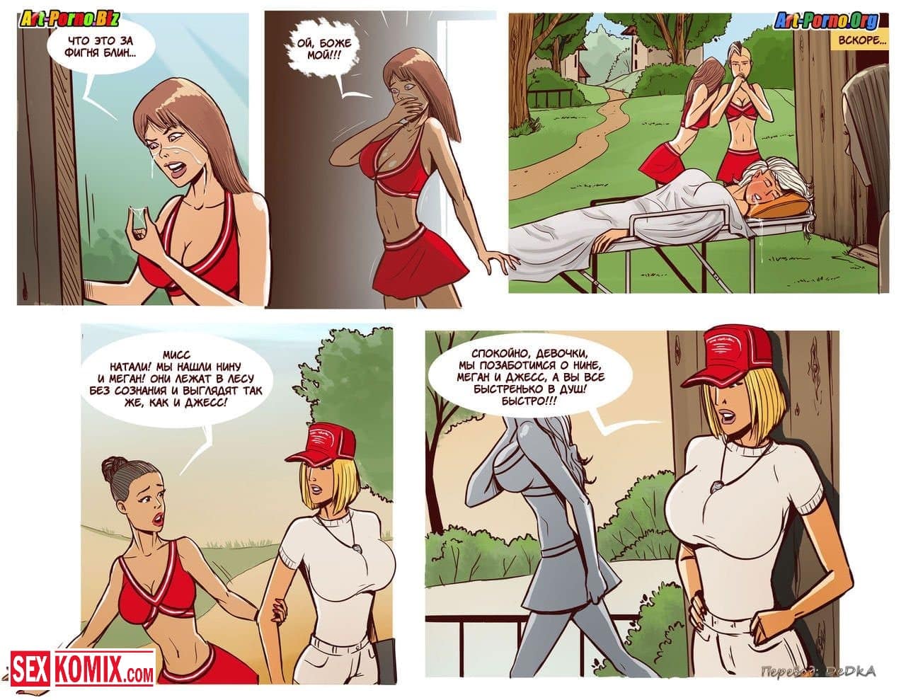 Порно комикс Происшествие в лагере чирлидерш. Из психлечебницы сбежал извращенный мужик, который был пойман за то, что соблазнял девушек и занимался с ними сексом. Его очень долго не могли найти, но как выяснилось он проник в летний лагерь черлидеров. Там много сексуальных девушек, и начал к ним приставать. Девушки не смогли отказать мужчине, потому что в лагере кроме них не было парней. Они соскучились по члену.
