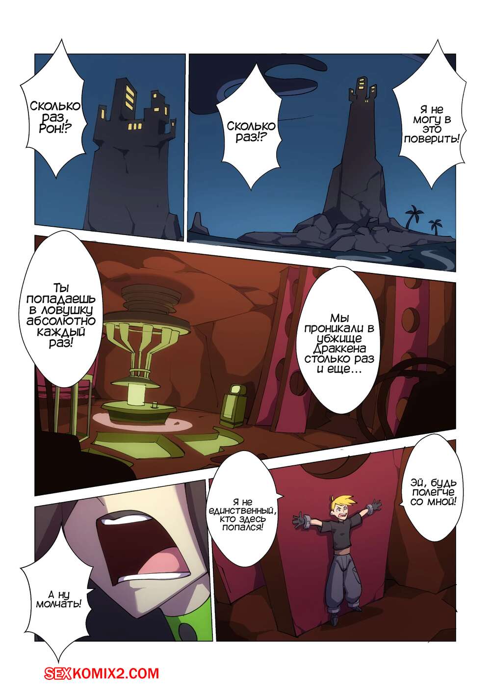 Порно комикс Kim Possible. Нет больше помощника. No More Sidekick. Nisego Ким и Рон попали в плен к горячей красотке брюнетке. Увидев у него огромный стояк, сучка невероятно возбудилась, поэтому она решила повеселиться с ним и отсосать его большой хуй, а затем хорошенько поебаться.