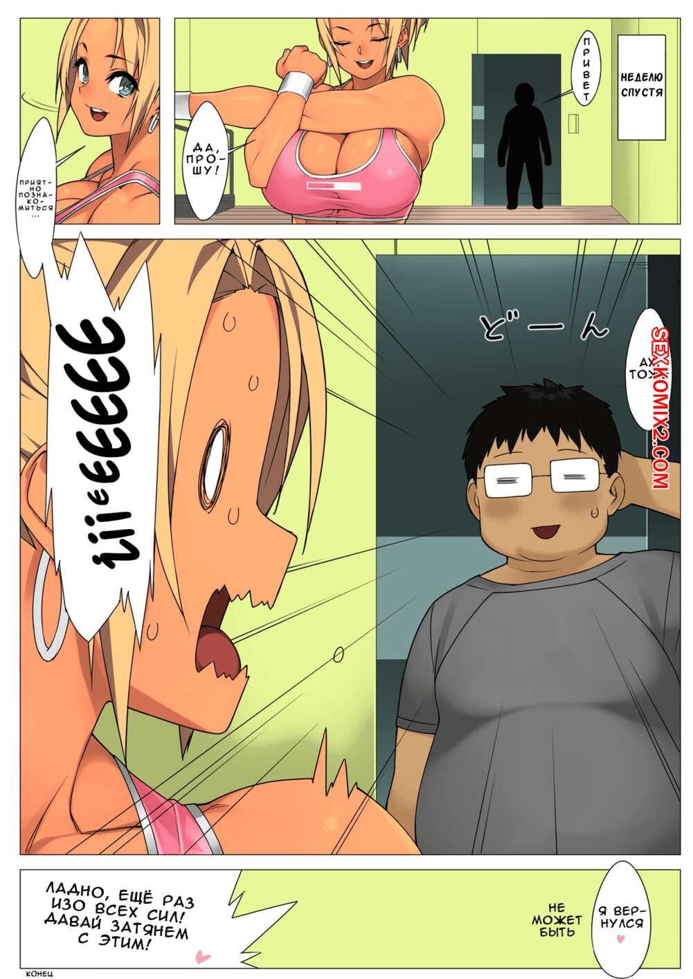 Порно комикс Тренировочный день. В цвете Горячая сисястая блондинка решила помочь парню в качалке и очень возбудилась. Она встала на колени перед парнем и стала сосать его большой хуй, а затем дала ему себя хорошенько выебать.